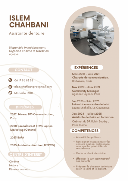 Assistante dentaire qualifiée, diplômée de l’AFPPCD, je possède une expérience en omnipratique et stomatologie acquise au sein d’un cabinet dentaire dans le 18e arrondissement de Paris.